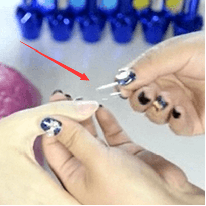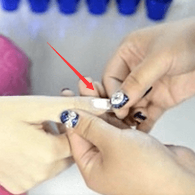 7. When the glue becomes ropy, place the nail tip on the surface of the nail, and keep pressing for a period of time.