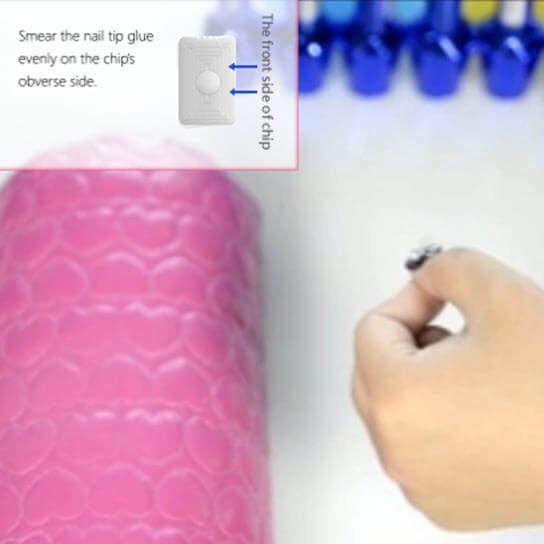 3. Determine the location where the nail tip fits the chip, and apply appropriate amount of glue, or smear the nail tip glue evenly on the chip¡¯s obverse side(surface with a protrusion).