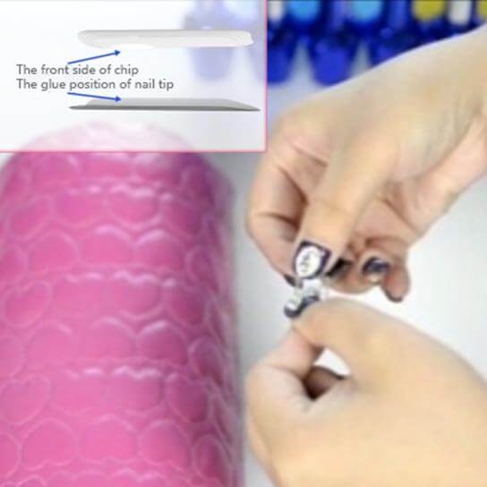 4. Then, paste the chip on the corresponding position of nail tip, please notice that nail tip should be glued with chip¡¯s obverse side(surface with a protrusion).